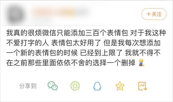 最后,微信表情包上限也一直是我很想吐槽的一个点,有这想法的还不止我一个: