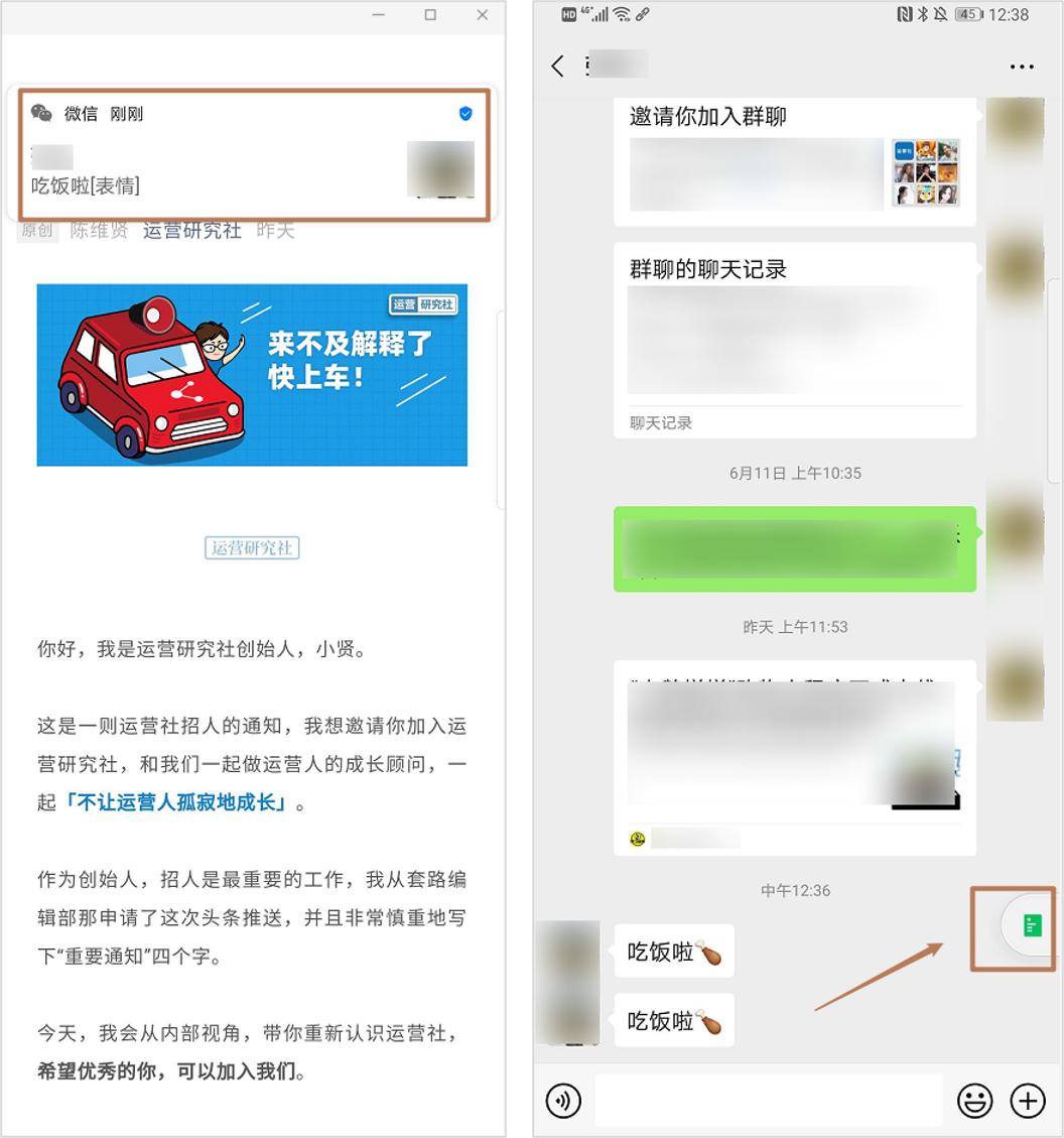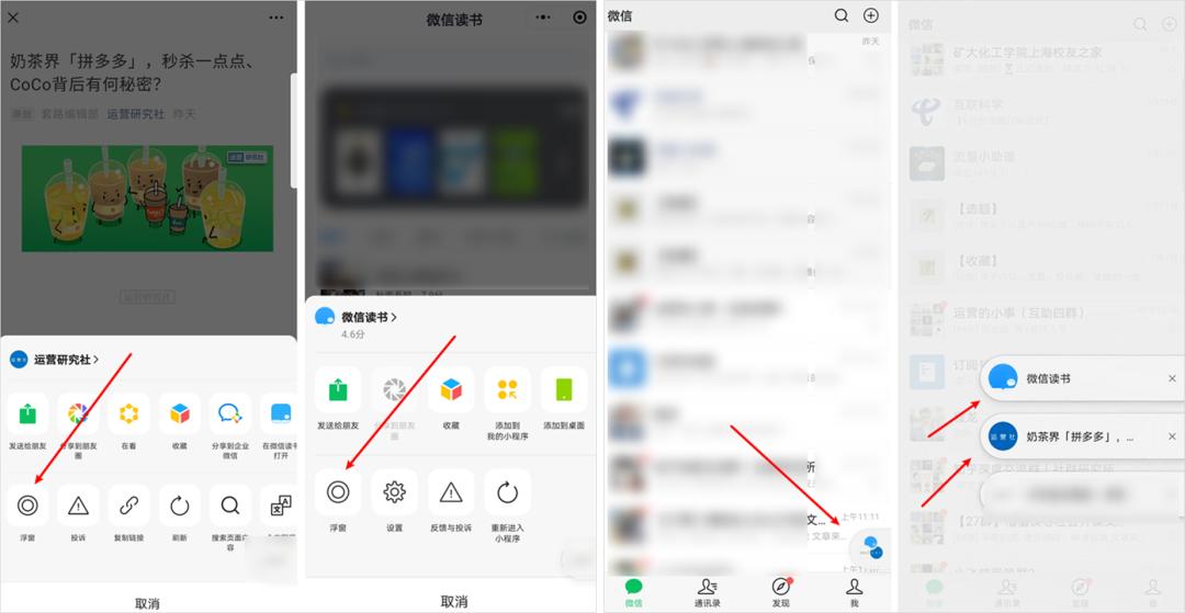 文章、小程序都可以选择开启浮窗。然后文章和小程序就可出现在微信的右边,点开后就能继续阅读文章或使用小程序。
