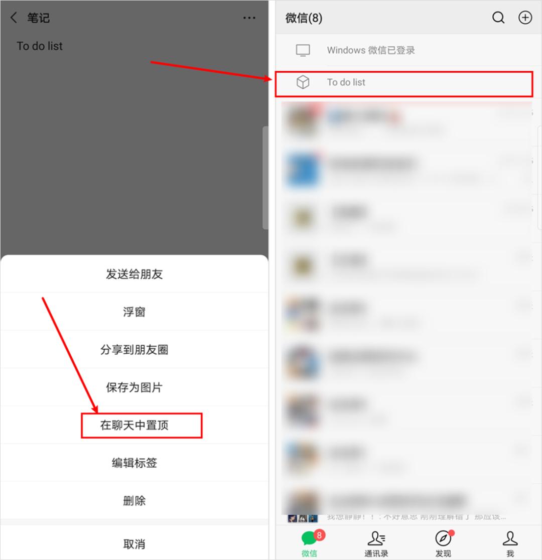 写完之后,可以保存为图片、设置为浮窗,更强的是可以「置顶」!置顶以后一打开微信就能看到今日 To Do List 啦,超方便的。
