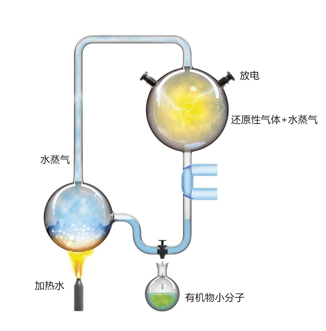 在这些地方,来自火山的各种无机物逐渐产生各种复杂的有机物,最终形成了生命。我们在初高中都会学到一个实验,在各大自然博物馆也总能见到这个实验:米勒实验。实验的内容就是,在玻璃容器中加入水、二氧化碳、氨气、二氧化硫等气体,一边加热水,一边给这些气体通电,最终在容器中发现了氨基酸。