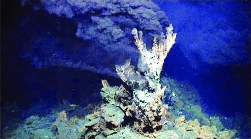 在这片海洋的海底,有些地方因为靠近海底火山,因此常年喷出大量含有矿物质的水,这些水往往呈现白色或者是黑色,因此被人称为海底黑/白烟囱。这些海底烟囱我们至今在大洋的洋底依旧可以看见。