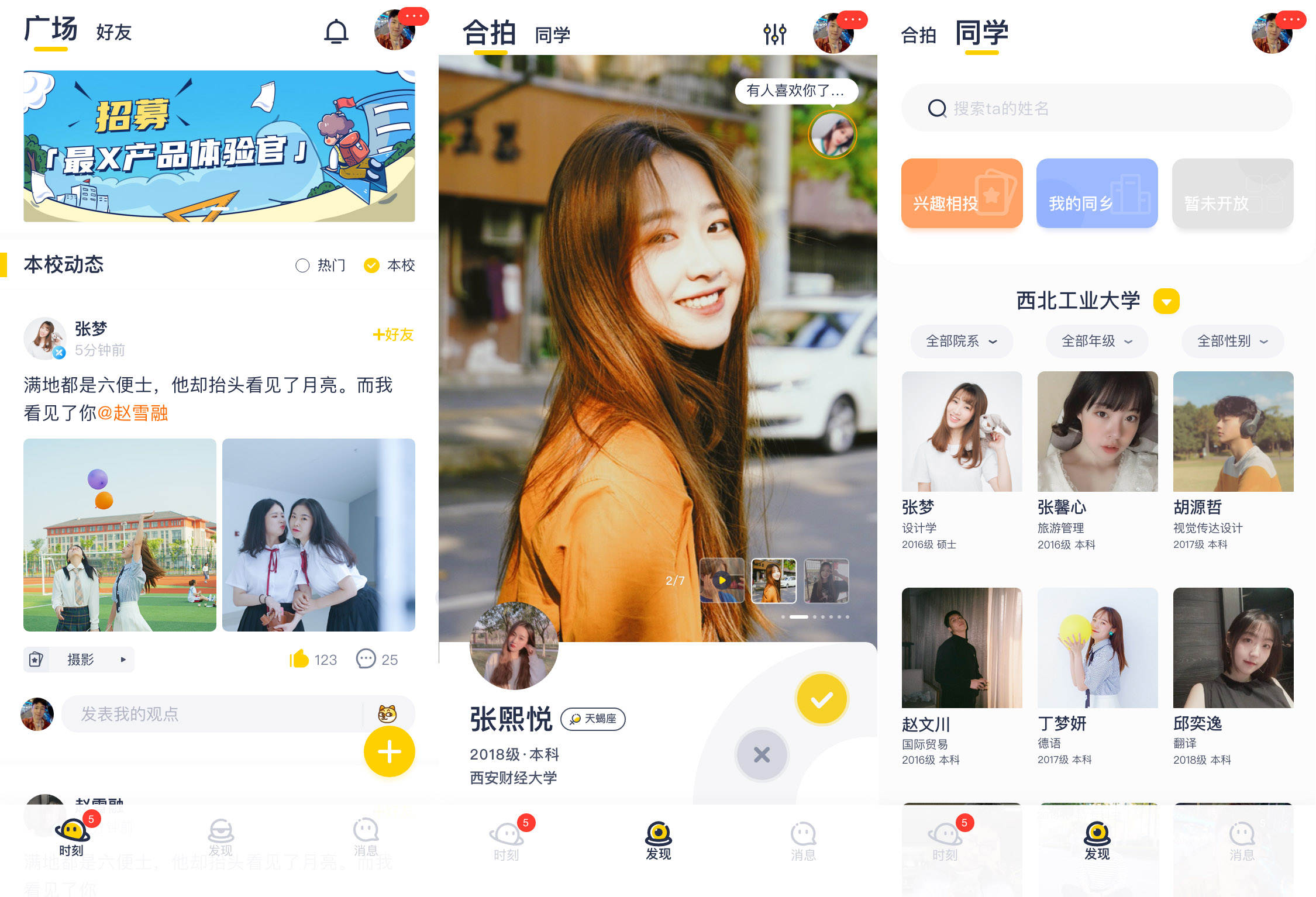 社交产品中,最重要的环节是建立和沉淀关系链。在青芒校园上,一方面,学生用户可以通过学校、专业、兴趣等信息主动寻找朋友建立关系;另一方面,平台也会基于用户信息建立算法匹配机制,向用户推荐好友,最终达成更有效的关系。在沉淀关系链上,青芒校园建立了社交广场,用户可以浏览、点赞、互动自己学校的动态和其他热门动态。