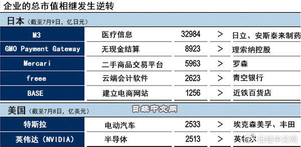 对新时代的预感已表现在总市值的变化上。例如,无现金结算服务提供商GMO Payment Gateway的总市值超过8900亿日元,超过金融企业理索纳控股(Resona Holdings,7月9日数据)。医疗信息企业M3的总市值超过日立制作所。市场正在观察附加值的产生场所和玩家的变化走向。