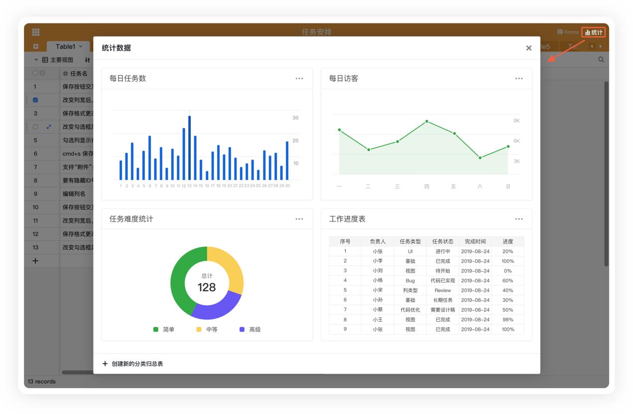 以视图形式实现对数据不同维度的分类、排序和过滤,简单直观,并能快速生成基础的统计图表。