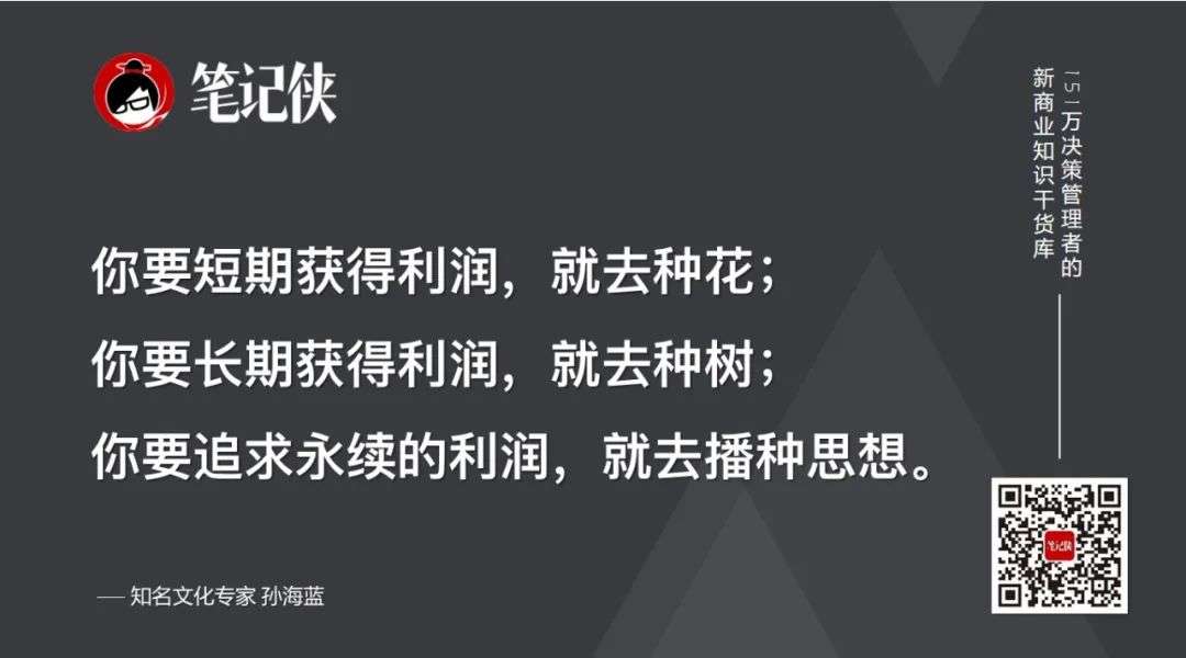 这让我想到了一句话:你要短期获得利润,就去种花;你要长期获得利润,就去种树;你要追求永续的利润,就去播种思想。