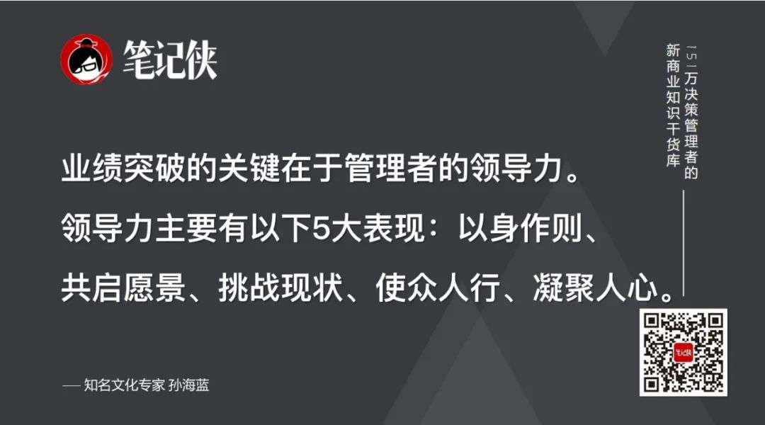 我们经常说这样一句话:业绩突破的关键在于管理者的领导力。领导力主要有以下5大表现:以身作则、共启愿景、挑战现状、使众人行、凝聚人心。