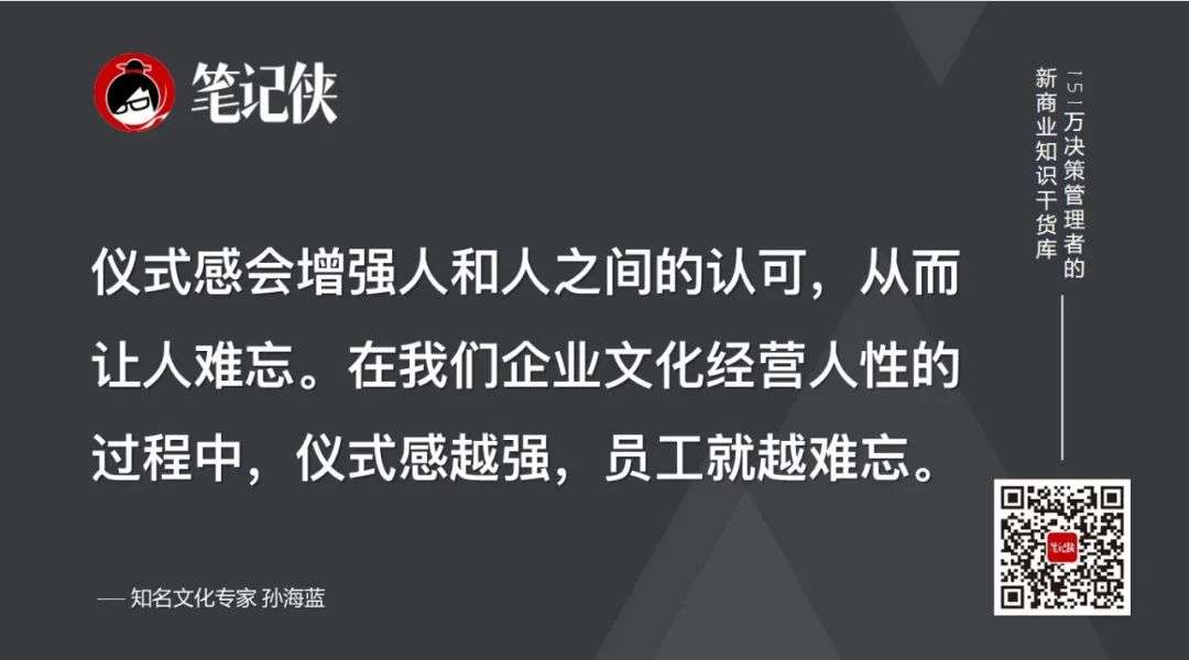 仪式感会增强人和人之间的认可,从而让人难忘。在我们企业文化经营人性的过程中,仪式感越强,员工就越难忘。