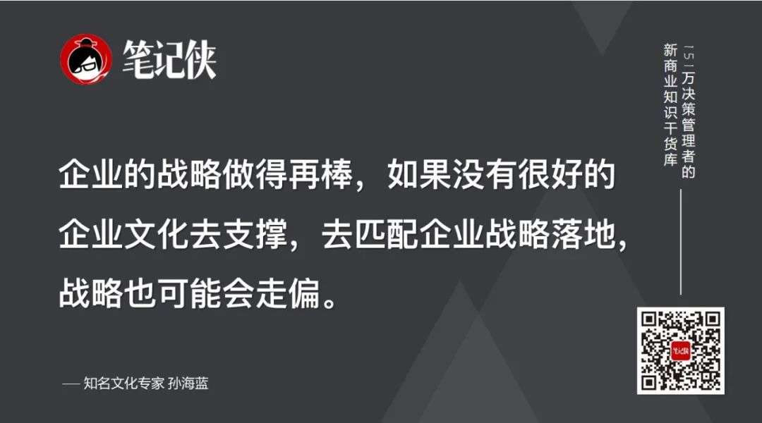 也就是说,企业的战略做得再棒,如果没有很好的企业文化去支撑,去匹配企业战略落地,战略也可能会走偏。
