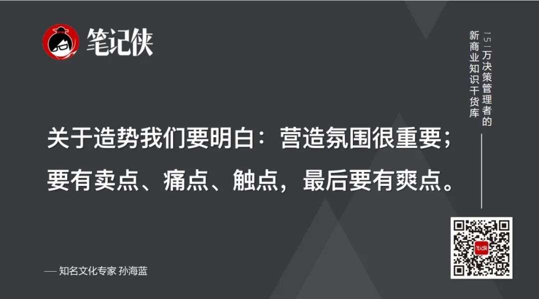 关于造势我们要明白:第一,营造氛围很重要;第二,要有卖点、痛点、触点,最后要有爽点。