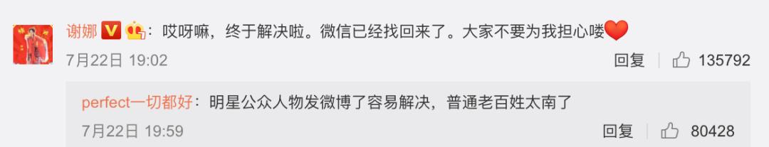 不到一小时后的 19 点 02 分,谢娜又发了一条微博,说问题解决了。