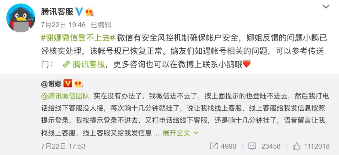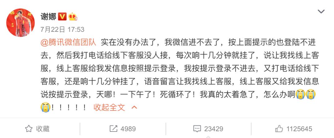 前两天,主持人谢娜的微信登不上去了。百般折腾无果后,去新浪微博发帖求助,并@了微信团队。