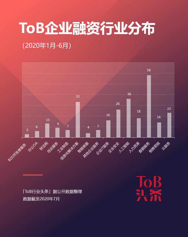 根据「ToB行业头条」整理的数据来看,数据服务、人工智能、信息化解决方案和云服务仍然是“热钱扎堆”的地方。