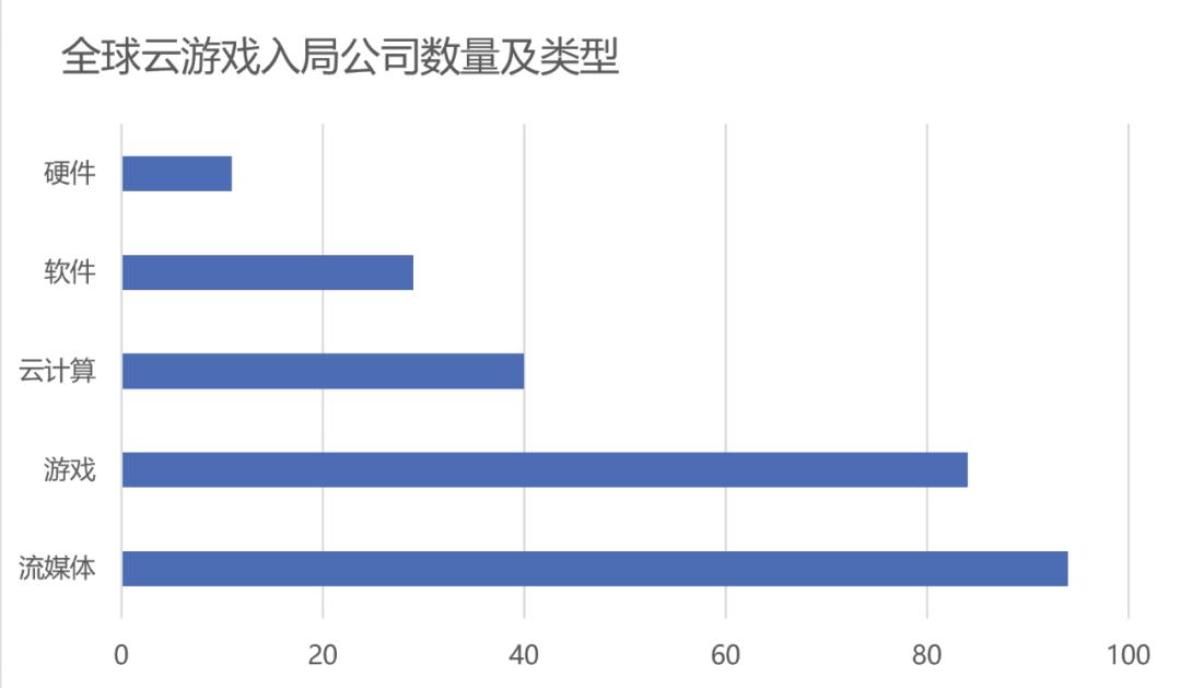有意思的一个趋势是,从公司类型来看,聚焦于流媒体与游戏行业的公司对云游戏行业兴趣相对更高。流媒体及游戏入局公司占比均超过50%,提供基础设施的云计算、硬件、软件公司相对较少。其中,硬件入局公司数量最少,仅为11家,其中4家为上市公司,头部企业垄断明显。