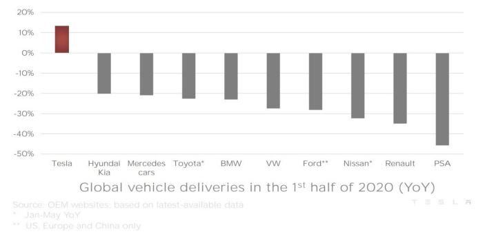 但在全球汽车交付疲软的情况下,特斯拉这份成绩单堪称惊艳,根据2020上半年全球汽车交付情况表,在福特、宝马、丰田等一众车企中,特斯拉是唯一一个汽车交付量正增长的企业。