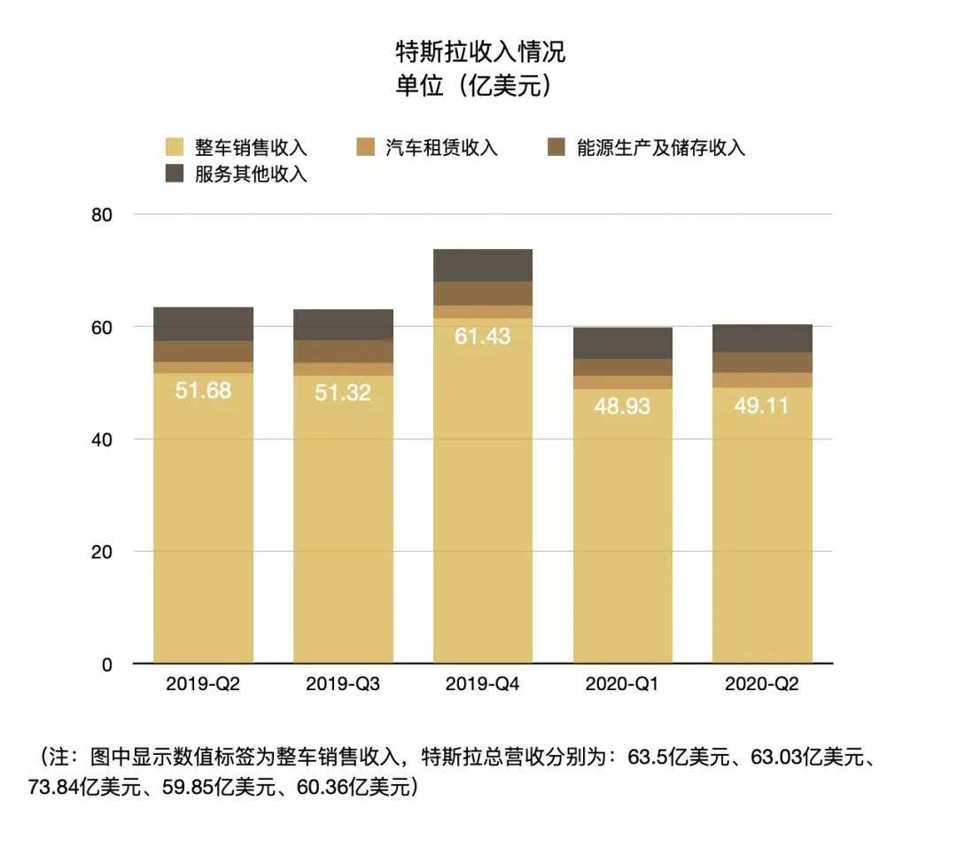 整体来看,特斯拉二季度收入实现营业收入60.36亿美元,同比下滑5%,环比上涨1%。收入由整车销售、汽车租赁、能源、服务等方面构成,整车销售是收入最大头。