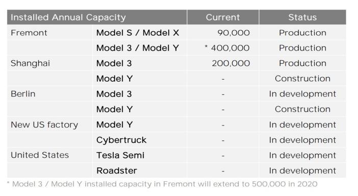 弗里蒙特工厂S/X产量9万台,3/Y当前产量40万台,但2020年装机容量将会扩大到50万,上海工厂产量20万台。