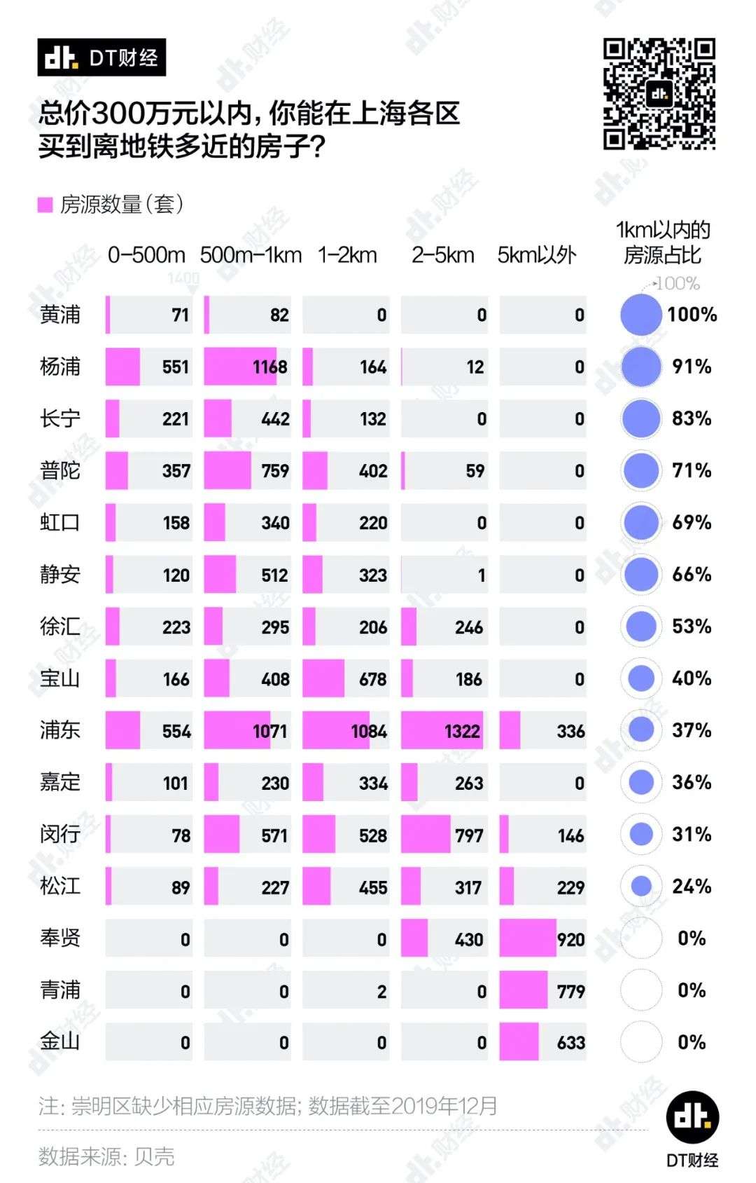 相比之下,西南各区房源的公共交通便利度就要低很多。比如奉贤、青浦和松江几个区,虽然300万的房源比较多,但没有一个靠近地铁站1km以内。