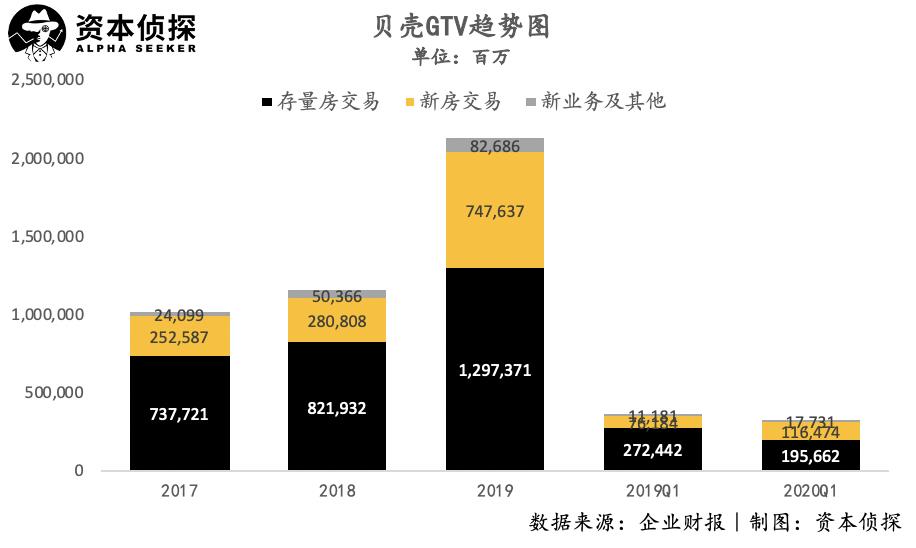 不过,整体来看,贝壳的营收与GTV的变化曲线几乎一致,可以推测,平台模式对贝壳营收盘子的推动还是比较明显。具体来看:2019年全年,贝壳实现GTV为212.8百亿人民币,同比大涨了85%,实现营收460亿元人民币,同比增长61%。今年一季度,受疫情影响,贝壳GTV同比小幅下降8%。