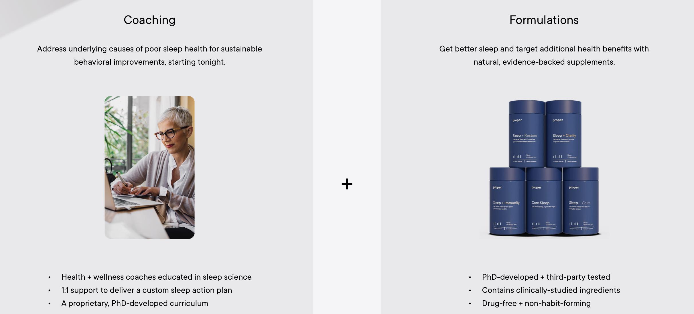 在「Proper」的官网上,消费者可以选择购买五种配方产品,分别是核心睡眠产品(Core Sleep)、睡眠+恢复(Sleep + Restore)、睡眠+平静(Sleep + Calm)、睡眠+清醒(Sleep + Clarity)和睡眠+免疫(Sleep + Immunity)。