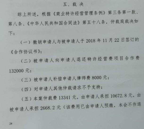 根据王明的说法,他在2020年3月下旬拿到了判决书,自己胜诉,欧本需要退还132000元加盟费,承担王明的8000元律师费和10672.8元仲裁费用。