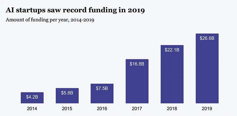 不仅是交易量再创新高,过去几年间,AI创企筹集的资金也一路猛增,从2014年的42亿美元增加到2019年的266亿美元。