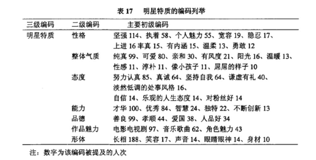 根据一份针对中国娱乐明星粉丝的研究表明,粉丝提及最多的明星特质,由高到低分别是:长相、坚强、才华、纯真、善良、影视作品、努力认真。