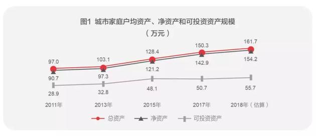 根据公开数据,2018年中国城市家庭户均总资产规模为161.7万元,户均净资产规模为154.2万元,户均可投资资产规模为55.7万元。
