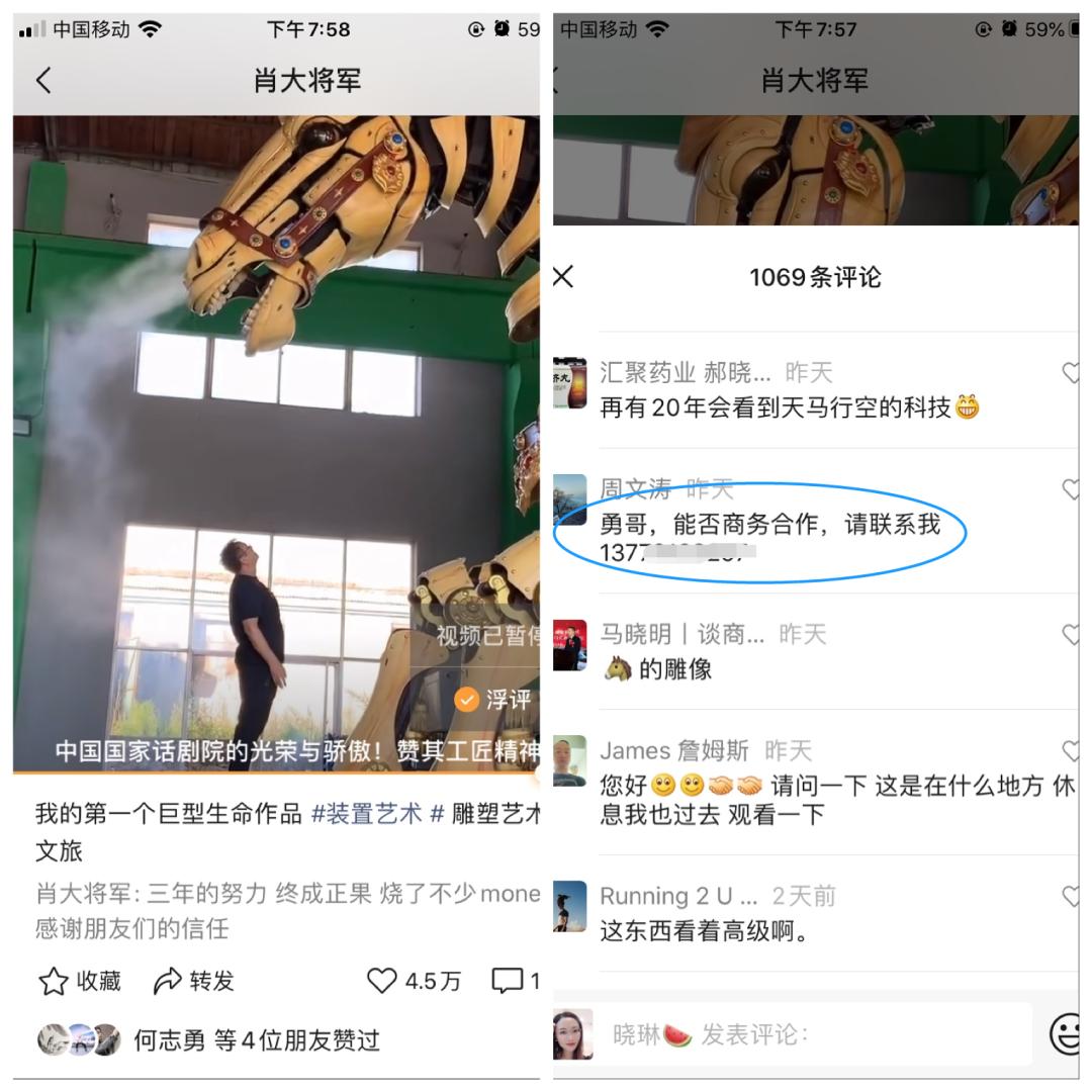 而视频号博主“肖大将军”的装置艺术品视频发布后,有些观者直接在评论区与其探讨商务合作事宜。