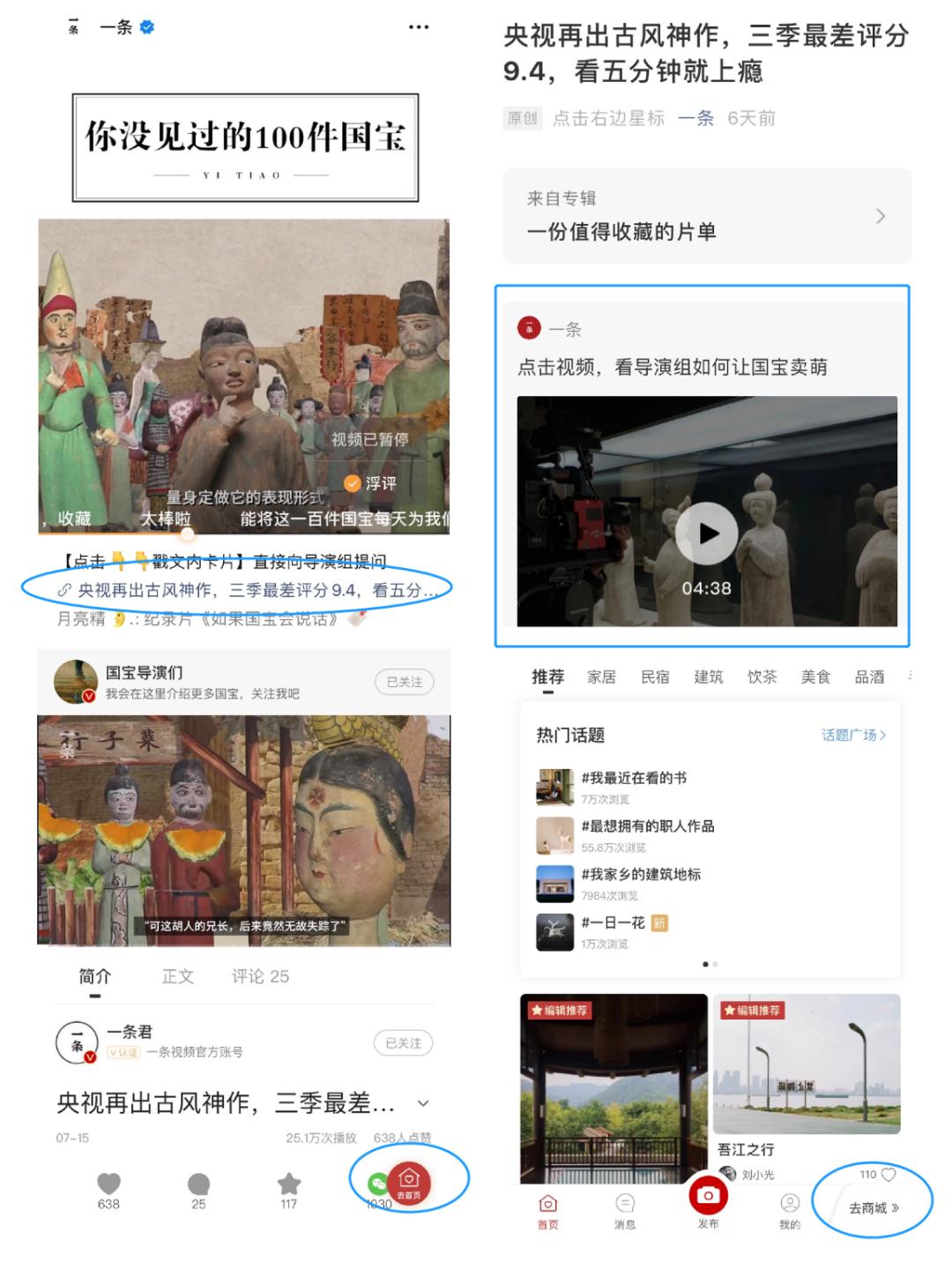 以视频号“一条”为例,点击短视频下面的公众号链接后,可以看到公众号文章上面露出的小程序视频卡片,点击后可以进入相应的“一条视频官方账号”小程序页面,然后点击右下角“去首页”按钮后,跳转到该账号首页,最后根据右下角的提示进入一条的小程序商城,便可以看到在售商品。