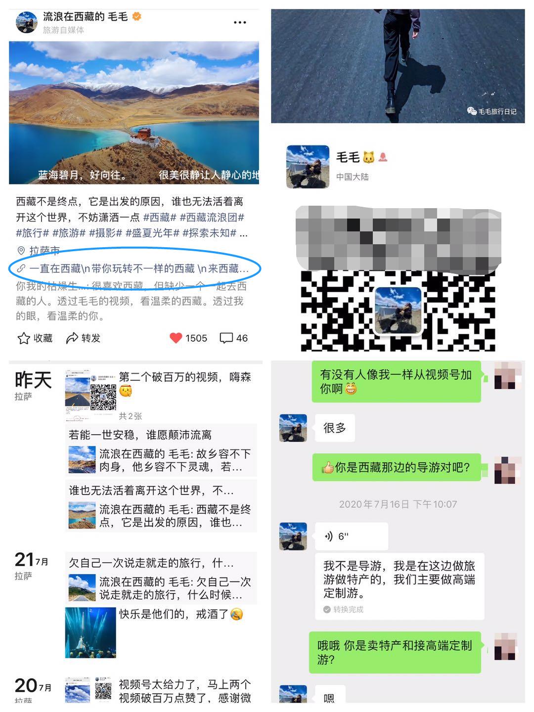而旅游自媒体博主“流浪在西藏的 毛毛”告诉亿邦动力,她于2020年4月开通了微信视频号,目前粉丝14万多。在近期发布的短视频下方,她加入了一个链接,点击后跳转至一个页面,其中同时展示有她的公众号和微信二维码,该微信号进行高端定制游接待及西藏地区特产专卖。