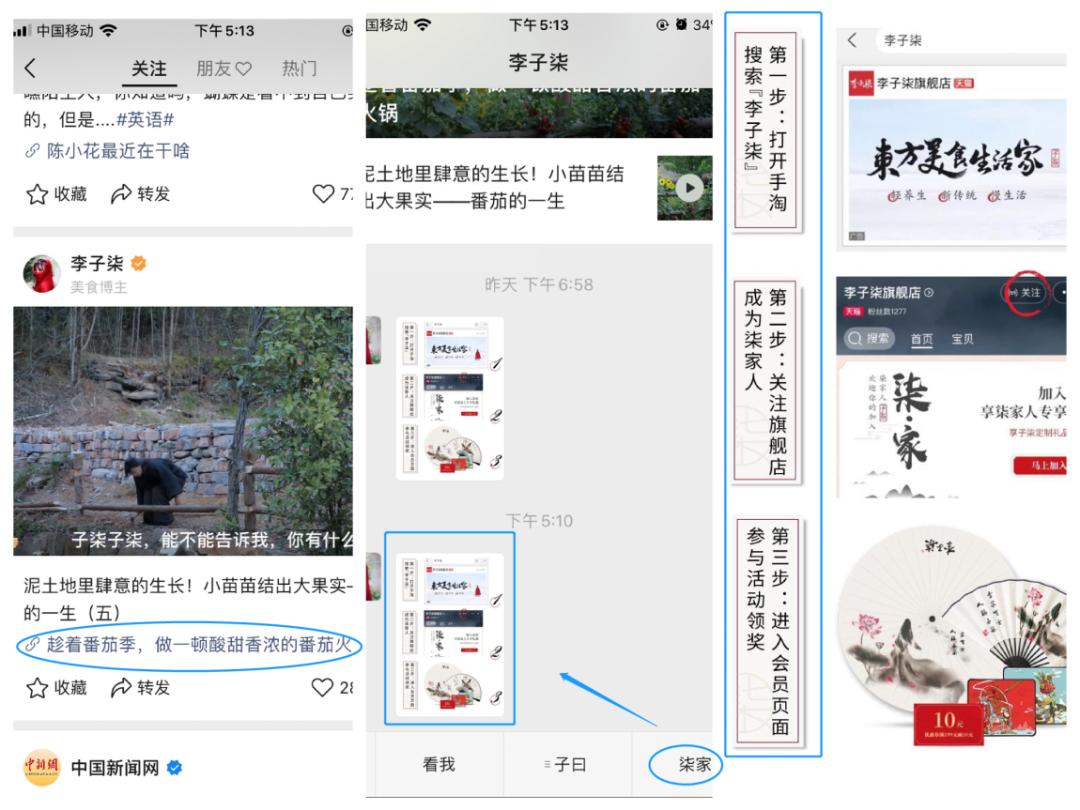 以李子柒的微信视频号为例,她在短视频下面挂微信公众号链接,用户打开该公众号文章、关注公众号后会弹出图片,该图片即显示出引导用户关注其天猫“李子柒旗舰店”的步骤。