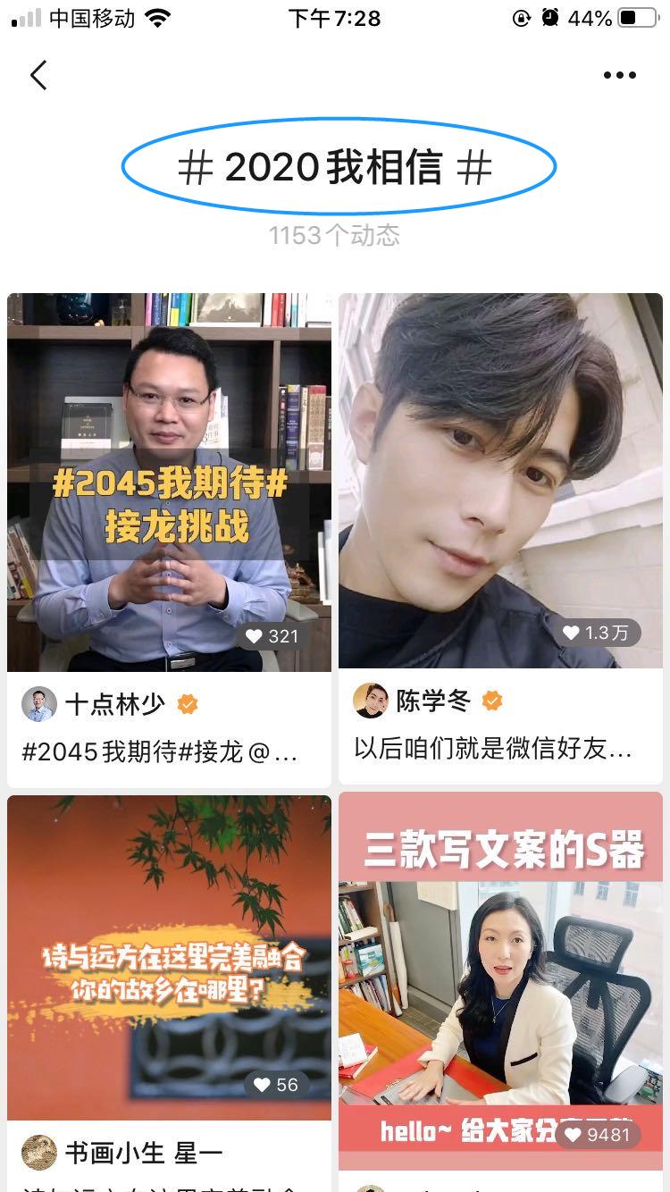 视频号推出之初正值疫情严重之时,林少与壹心理商务负责人阿喵联合发起了以#2020我相信#为话题的视频征集活动,13天内就有包括新榜高管、航空行业大佬、明星陈学冬等在内的各行业700多位人士参与,至今已有1153个视频发布在该话题中。