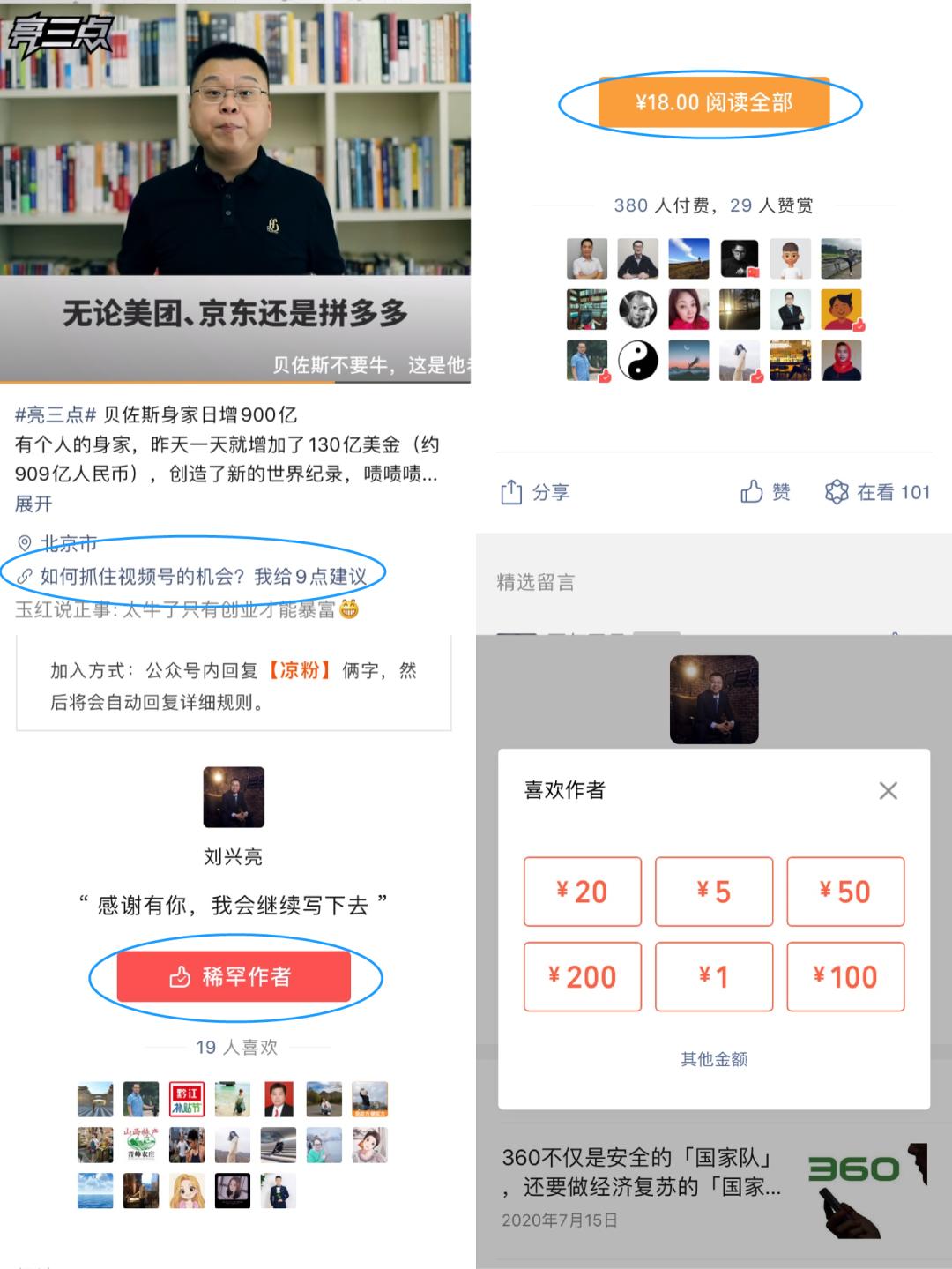 例如,资深视频号玩家刘兴亮在其视频号中发布关于短视频及电商观点等内容,在视频下方插入自己的公众号文章链接,而文后即有付费阅读和打赏功能。刘兴亮告诉亿邦动力,他的一篇关于视频号创作的文章设置了付费3元阅读全文内容后,共计有5000多人购买;另一篇付费18元阅读全文的文章目前已有380人付费、29人打赏。