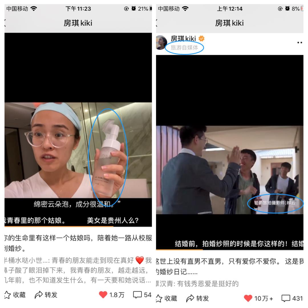 例如旅行博主房琪kiki在视频号内测早期就入驻了视频号。截至2020年7月22日,她共发布了60条短视频,其中4条点赞超过10万。除了旅行题材,房琪还发布了一些生活类短视频。其中有些视频里面会短暂植入广告,如在一条讲述闺蜜感情的视频中植入一款洗面奶的品牌广告,在一条描述婚纱照故事的视频里植入某婚纱摄影的广告。