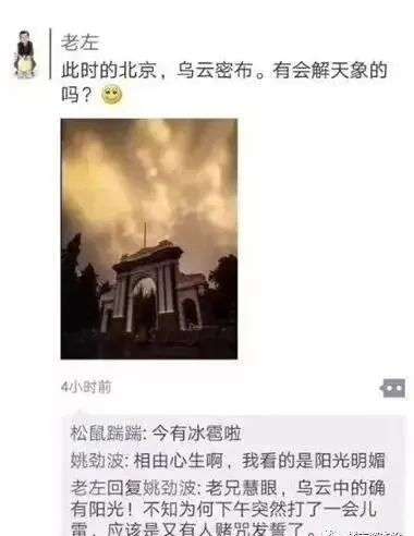 左晖回复:“老兄慧眼,乌云中的确有阳光!不知为何下午突然打了一会儿雷,应该是又有人赌咒发誓了。”