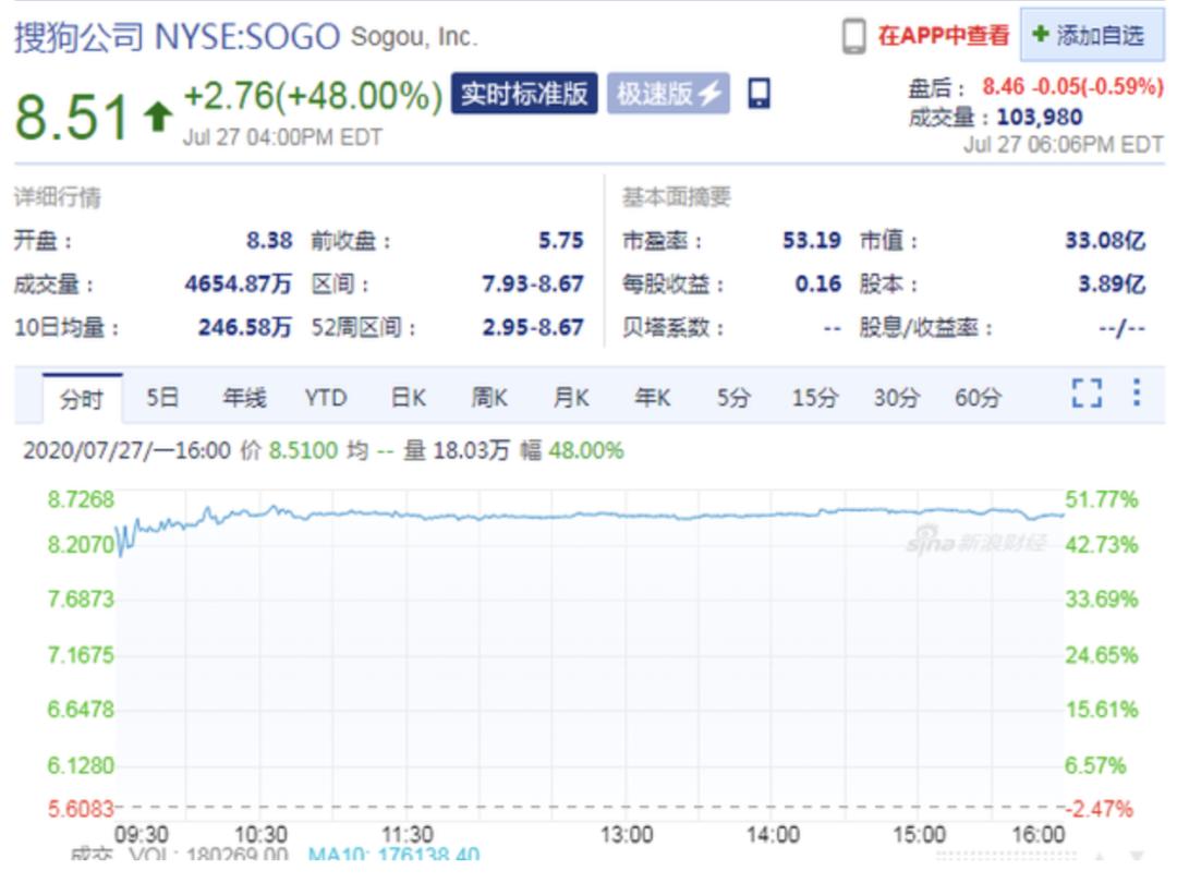 受拟腾讯拟收购消息影响,搜狗 7 月 27 日收盘股价暴涨 48%,报 8.51 美元。