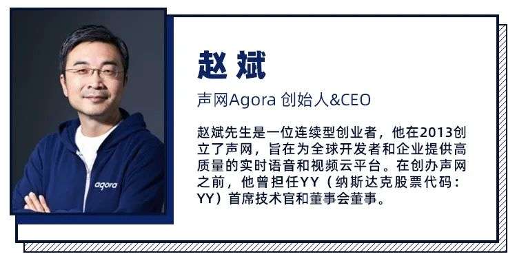 *作者简介:赵斌先生是一位连续型创业者。他在2013创立了声网,旨在为全球开发者和企业提供高质量的实时语音和视频云平台。在创办声网之前,他曾担任YY(纳斯达克股票代码:YY)首席技术官和董事会董事,YY是全球最早创立的视频社交网络和直播应用软件之一,用户数量超3亿。他还曾是网讯公司(Webex)创始工程师之一,该公司于2007年以32亿美元的价格被美国思科收购。