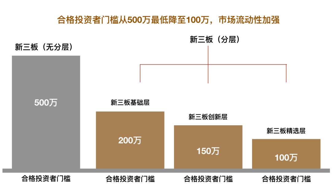 通过此次精细化分层和配套机制改革,增加了市场流动性,充分激发市场活力。改革后,新三板基础层、创新层、精选层合格投资者门槛由原来统一500万元分别降低至200万元、150万元、100万元,门槛大幅降低。