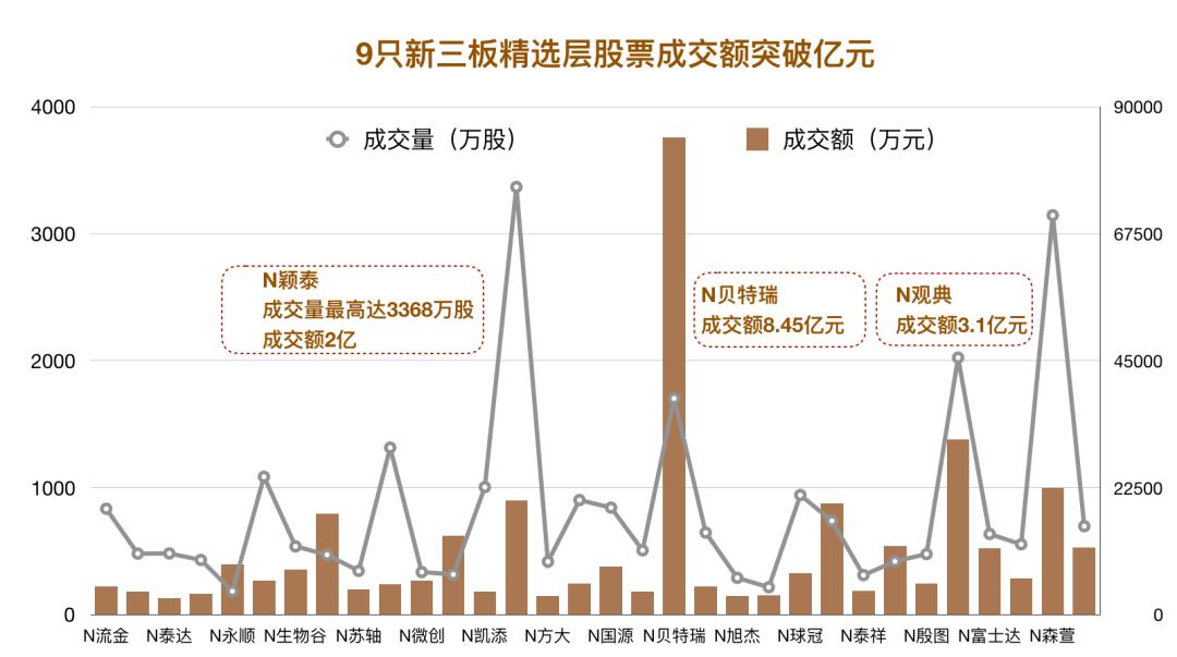 32只精选层股票总成交额突破36亿元,成交量达2亿股左右,平均换手率在16%左右。其中9只股票成交额均突破1亿元大关,N贝瑞特成交额最大达8.45亿元,N颖泰成交量最高达3368万股。