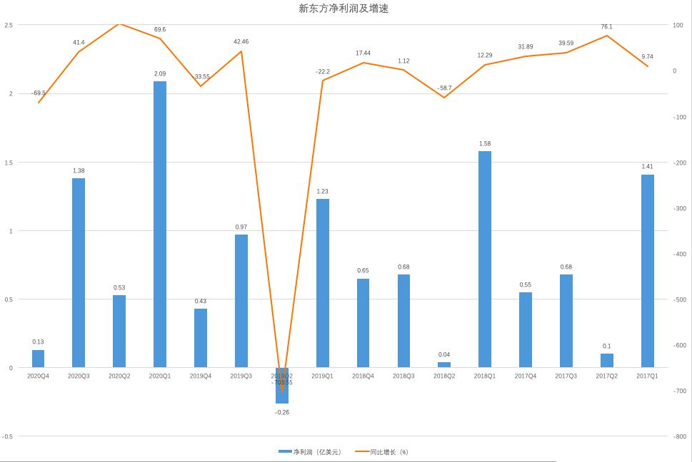 财报显示,2020财年第4季度净收入逾7.98亿美元,同比下降5.3%;运营利润1030万美元,同比下降86.7%;归属于新东方的净利润为1320万美元,同比下降69.5%。