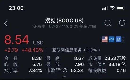从股票的表现就可以看到这桩收购的价值:搜狗自三年前上市后,股价长期低迷,一直低于5美元,最低今年到过2美元多。而该消息 一传出,搜狗和搜狐美股盘前涨幅持续扩大,搜狗美股盘前一度涨超43%,截至北京时间7月27日晚22:55,搜狗股价为8.54美元/股,上涨达48%。