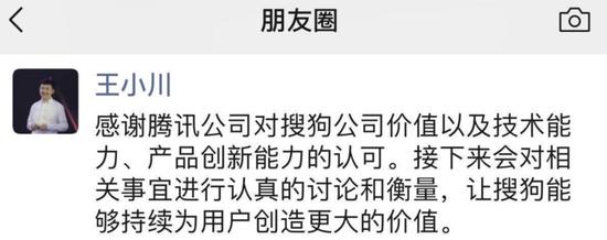 搜狗CEO王小川的态度自然是积极的,他在朋友圈发文称,感谢腾讯公司对搜狗公司价值以及技术能力、产品创新能力的认可。接下来会对相关事宜进行认真的讨论和衡量,让搜狗能够持续为用户创造更大的价值。