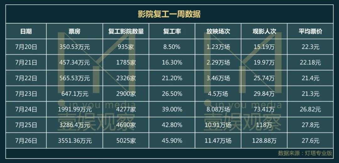 7月20日,全国影院复工率仅有8.5%,累计仅有953家影院复工,首日累计350万元票房,吸引15.19万观影人次,其实影院复工开局效果并不理想。