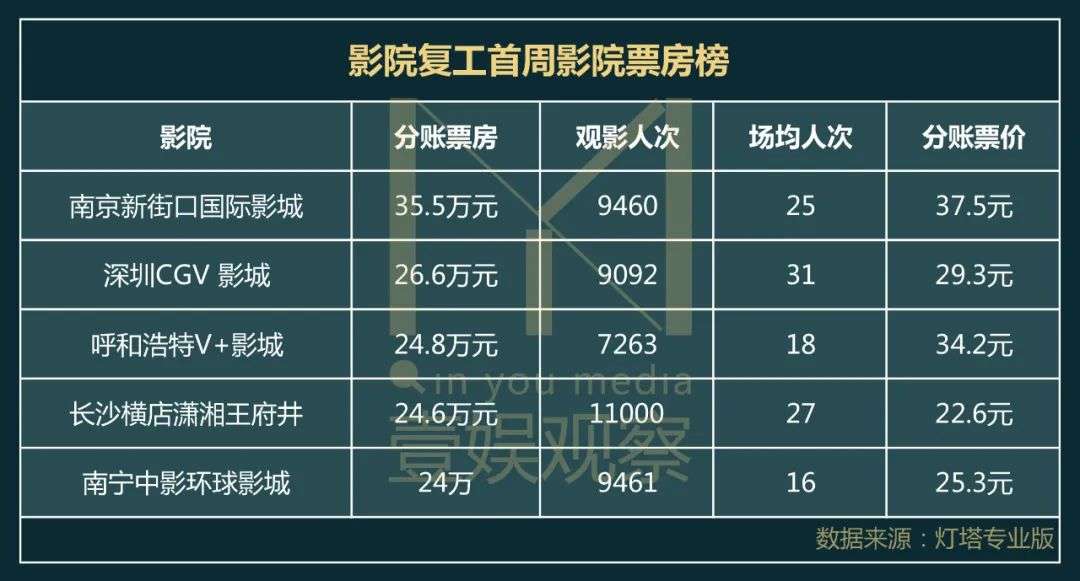 据灯塔专业版数据,全国影院复工首周票房冠军是南京新街口国际影城,分账票房35.5万元,第二位是深圳CGV的26.6万元,累计观影人次最多的是长沙横店潇湘王府井影城,达1.1万。
