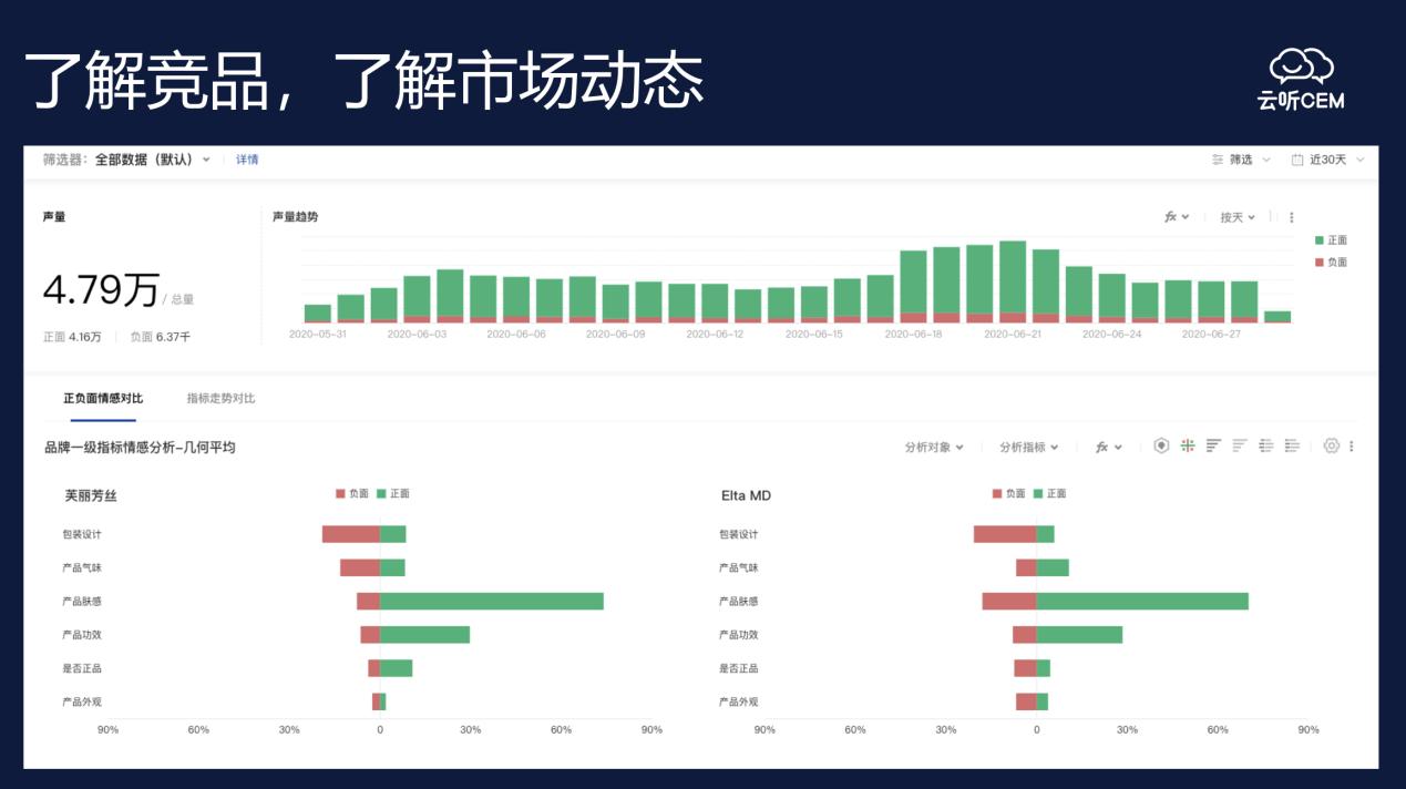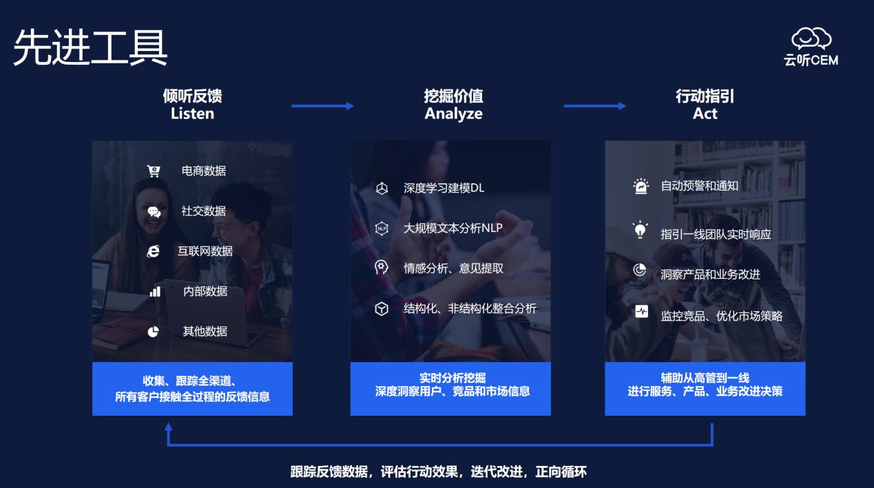 先进工具。要把客户体验做好,除了有想法、有人以外,还需要先进的工具去帮助品牌搜集、分析、管理客户体验,进而指引品牌的行动。搜集各个渠道、各个触点的数据,这是做好客户体验管理的第一步。你得先知道客户的声音,这是非常关键的一点。而这一点很难靠人去完成,因为中国有上亿的消费者,他们的反馈信息太多了。比如说电商评论,一个产品动辄十万上百万的评论;比如说社交媒体,每天那么多的消息,在表达对品牌对产品的看法;还有垂直媒体、企业内部每天一两万客户的在线聊天/电话、线下售后体系等。以往品牌大多通过问卷调查搜集客户声音,但这个样本非常小,与上千万的消费群体对比,能搜集的数据太少了。以此来做分析,那真的是差之毫厘,谬之千里。云听CEM可以帮助品牌企业将所有外部线上的数据、内部所有客户反馈的数据以及调研渠道的数据全部整合在一起,你的客户反馈数据在哪里,我们就把这些渠道接进来,再使用人工智能算法分析消费者的反馈。消费者的反馈一般是文本,如果是语音的话,可以先转成文本再处理。这项工作也很难靠人去完成,需要用到人工智能算法,用机器和模型代替人类去分析消费者反馈。云听CEM的分析准确度比一般分析团队高些,并且能对百万数据进行秒级处理,对每一个字背后的意思进行精准分析,以此精准量化各项反馈,比如我产品每个颜色有多少用户认可,多少用户不认可,比如我产品的某个功能,与竞争对手相比差几个百分点。这样所有的问题都能得到量化并按严重程度排序。接下来我们就知道优先改善什么、如何改善。再有一个就是及时预警。我们不可能每天盯着每个SKU、每个细节去看。在云听CEM中可以设定一个范围,如果某个体验值出现异动,是可以及时预警的。先进的工具还需提供深入的洞察力。在设计新产品,制定新的营销策略时,云听CEM可以帮助品牌深入洞察消费者反馈,做出有效决策。当采取行动后,工具又能自动监控反馈变化,持续跟进改进效果,直至改善到规定的水平,形成良性闭环。