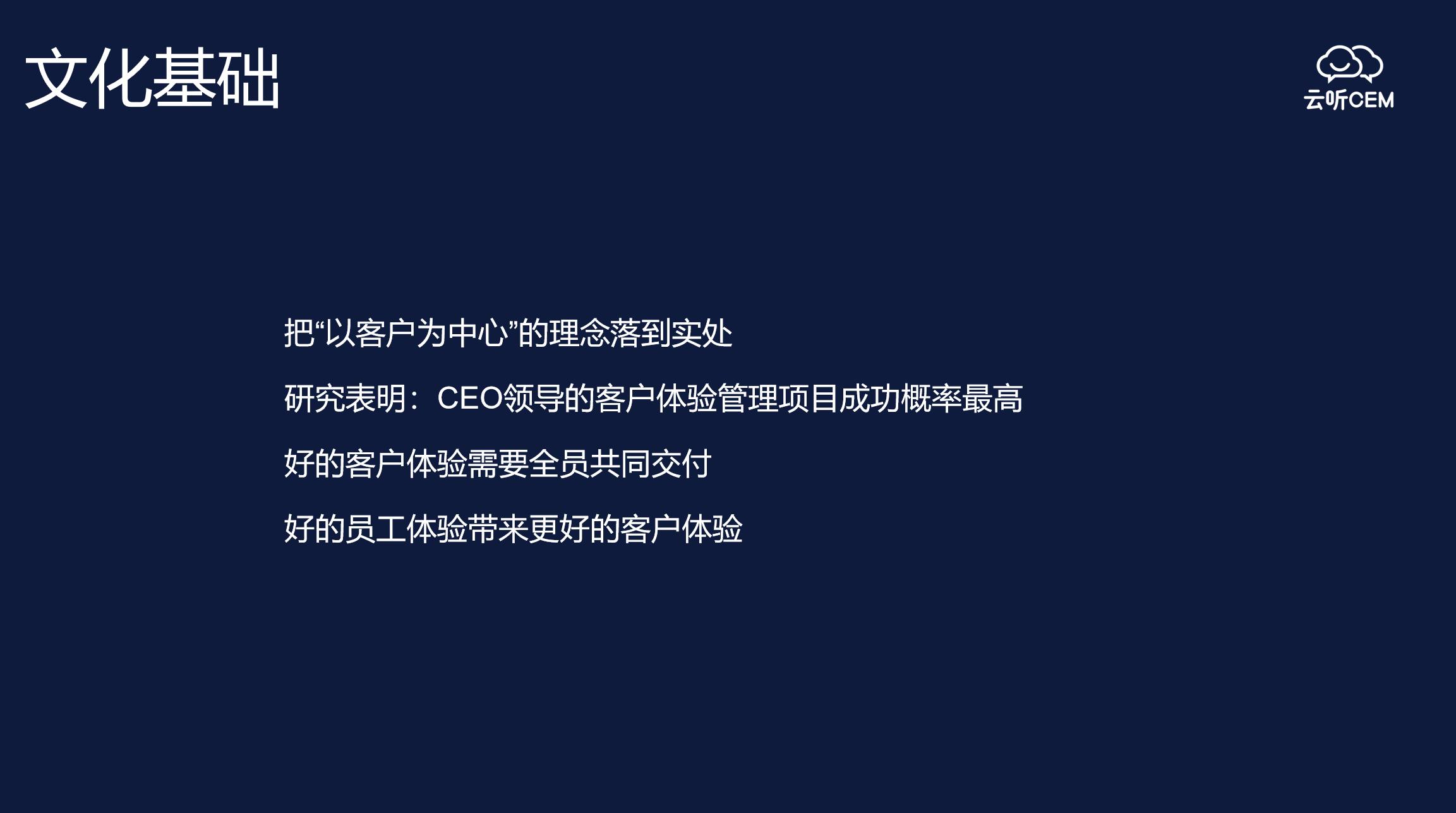 文化基础。企业文化环境,是大的保障与支撑。以前品牌对营销太过重视,营销很重要,但是客户同样也很重要。品牌需要有一个重视客户体验的文化环境。第一:把“以客户为中心”的理念落到实处。什么叫落到实处?在文化价值观里写上“客户是上 帝”显然是不够的,你需要每天看消费者在说什么,需要在做每一个新功能的时候都考虑有多少用户喜欢,在这些日常工作中把以客户为中心落到实处。第二:CEO领导客户体验管理项目。我们的研究数字表明:从CEO或者说高管层面去推动的客户体验管理的项目,最终成功概率非常高。如果只是某个团队、某个部门想推进客户管理的话,有一定的概率做不起来。第三:好的客户体验需要全员共同交付。包括跟客户接触的销售、售后服务,或者没有直接跟客户接触,但通过产品与客户接触的产品研发、设计、品控人员等,全员都要有这个理念。同时还涉及到一个员工体验管理。要交付一个好的客户体验,首先要让整个企业的员工感觉体验良好。只有员工体验好了,有了很好的心情工作,才能更好地服务客户、更好地向客户传达公司的价值主张。