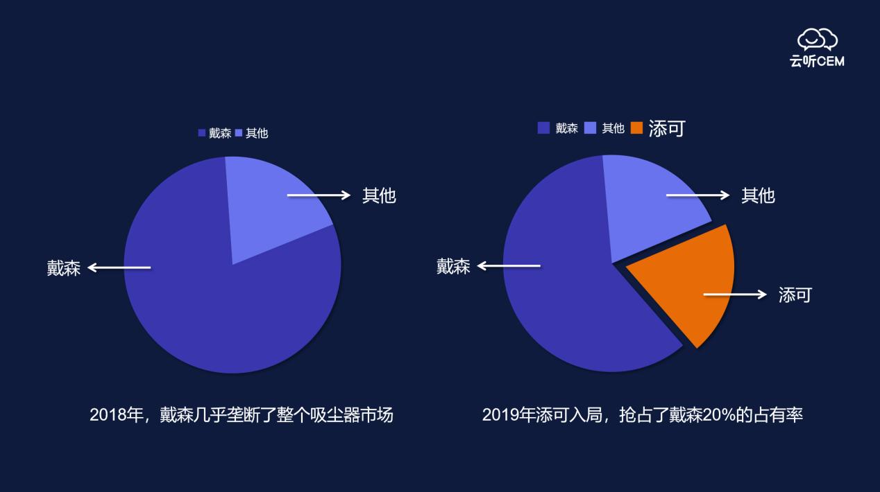 再讲一个通过做好客户体验快速提升市场份额的真实案例。添可是科沃斯董事长钱董新创建的一个品牌,市面上对标的品牌是戴森。大家用过戴森的产品就知道,他们的外观设计、产品功能等各方面都是挺讨喜的,客户体验挺不错。添可也是这么定位,他们整个公司非常关注客户体验,进行了一整套的客户管理体验升级,成果十分显著,在海外市场很受消费者欢迎。以吸尘器这个产品为例,2018年戴森占据80%市场份额,其他的品牌价位都比戴森低,大概占20%的市场份额。但是2019年添可入局,短短一年时间内从戴森手上抢走20%的高端市场份额,这跟添可的客户体验管理理念密不可分。钱董以前给我们上课的时候就经常把用户在亚马逊的购物平台上购买评价拉出来,说你看,我们在这一点上做的很好,给用户很好的体验,用户之间的口碑传播有多厉害。我们有数据表明,客户认可你,觉得你的产品非常好,写个好评,或者在社交媒体上发个动态,一般情况下至少能带来20个新增的购买。这又回到我们刚说的,把客户变成品牌的布道者,带来的增长是异乎寻常的。