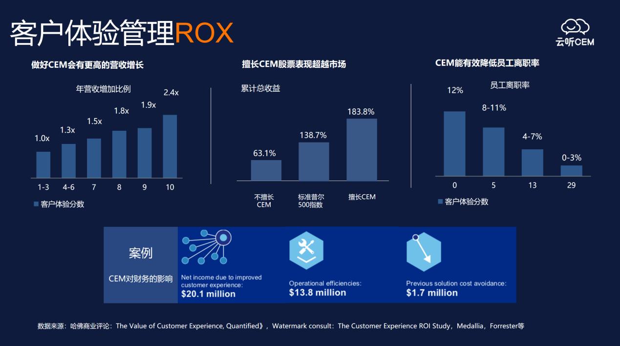 我们在重视ROI的同时,更需重视ROX(以消费者为中心的体验回报率),在这种前提下,我们用心做好客户体验,客户就会成为品牌的布道者。提升ROX的关键是善用CEM,做好CEM有利于加快营收增长、提升股票表现、降低员工离职率,并且需要通过文化、团队和工具三个层面去展开:文化层面,将“以客户为中心”的理念落到实处;团队层面,客户体验管理团队需要同时精通CEM理念和业务,把客户体验管理纳入企业顶层架构,设立C level的客户体验管理团队;工具层面,利用像云听这样的先进CEM工具,能够有效跟踪反馈数据、评估行动效果,实时迭代改进,达到正向循环。