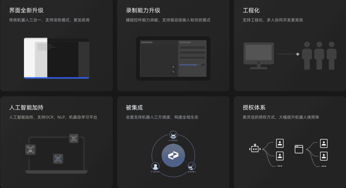 据了解,本次发布的RPA新亮点主要聚焦于用户体验、技术升级以及AI赋能几大方面。用户体验方面,将理性的技术与感性的体验相结合,从品牌升级、编辑器交互、机器人三合一、机器人mini模式进行提升,打造简洁、专业、高效的机器人流程自动化;技术升级方面,在整体架构加入工程的概念,使RPA编辑器对工程进行构建,同时实现多流程支持;AI赋能方面,在阿里达摩院强大的AI赋能下,做到毫秒级的快速响应,快速抽取信息并且完成文本分类以及人机对话,还可以通过机器自学习平台,快速建设平台化能力,支撑客户定制化需求。