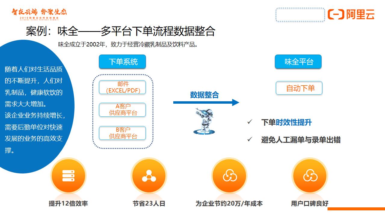 百胜软件作为一家拥有20年沉淀的信息科技企业,是阿里云在RPA方面重要的战略合作伙伴之一。目前,阿里云RPA与百胜软件已在零售领域发展客户100多家。以阿里云RPA所服务的客户味全食品为例,该项目由百胜软件负责交付落地,味全作为乳饮制品制造业的龙头老大,其内部供应链、系统及客户群体庞大且复杂,随着业务的不断扩大和规范化,流程日渐冗长、固化,对于员工工作而言附加值较低。以其供应商与客户对接流程举例,需经过邮件、味全供应商平台、味全智慧平台至少3个系统,涉及订单录入、下单、整合、回复等操作,已大大拉低了日常运营效率。